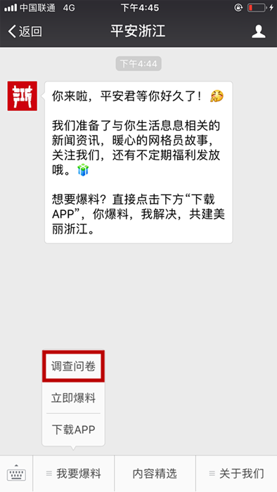 2、點(diǎn)擊最下方“我要爆料”,選擇“調(diào)查問(wèn)卷”