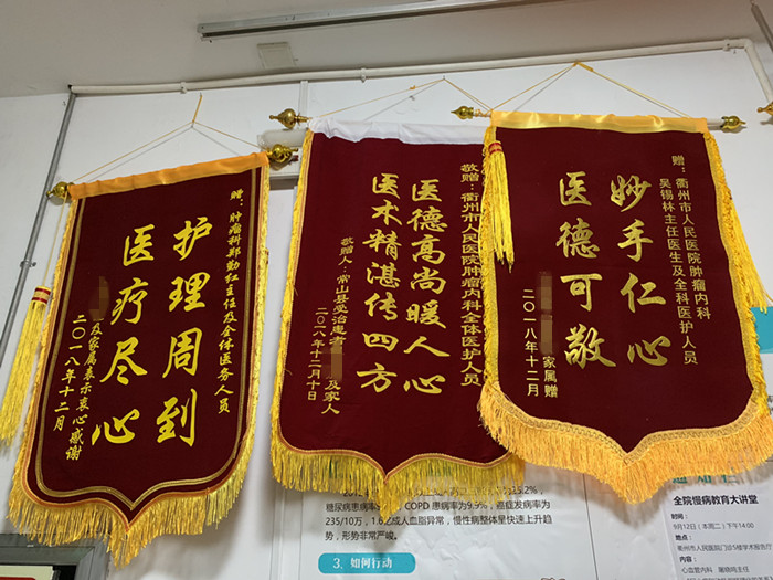 12月12日,常山的程大爺和他的妻子如期來(lái)到腫瘤內(nèi)科病房,因?yàn)樗幕煏r(shí)間到了。這次他專(zhuān)門(mén)帶來(lái)了一面錦旗,上面寫(xiě)著“醫(yī)德高尚暖人心,醫(yī)術(shù)精湛傳四方”。程大爺說(shuō)這是他專(zhuān)門(mén)請(qǐng)當(dāng)?shù)氐念}詞人寫(xiě)的,的確,程大爺就是這樣一個(gè)事事認(rèn)真、樸實(shí)和善的老人。