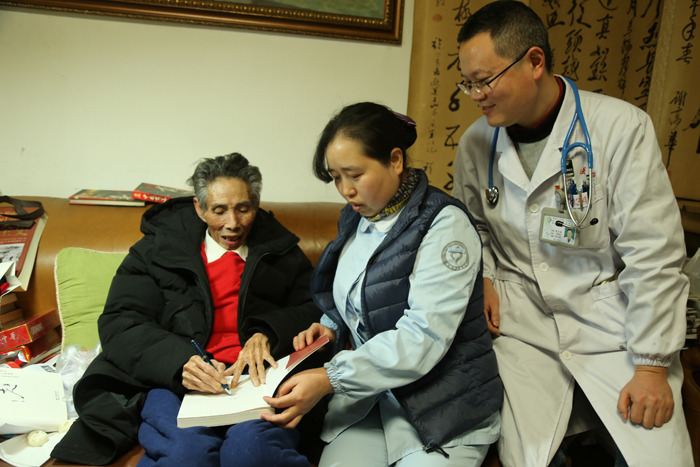 醫(yī)護(hù)人員為 謝老做健康檢查、指導(dǎo)用藥