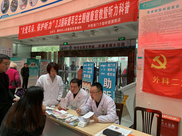 3月3日,我院外科二黨支部第一黨小組成員在支部書記蘭金山的帶領(lǐng)下,于醫(yī)院一樓門診大廳內(nèi)舉行“關(guān)愛耳朵、保護聽力”3.3國際愛耳日主題健康宣教暨聽力科普活動。