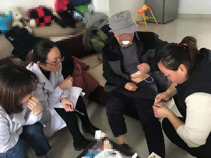 腹透醫(yī)生喻敏、腹透護(hù)士毛玲玲、張何虹給病友做檢查,從血壓、尿量、體重的日常監(jiān)測(cè),及環(huán)境、飲食、用藥等方面進(jìn)行指導(dǎo)。