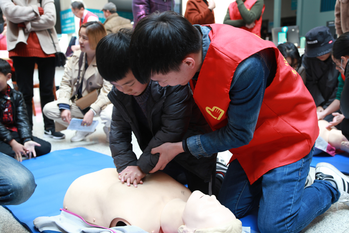 醫(yī)護(hù)人員為市民提供免費(fèi)測量血壓、血糖和宣教服務(wù)。麻醉科主任蘭允平帶領(lǐng)醫(yī)護(hù)人員、志愿者,為在場的市民進(jìn)行心肺復(fù)蘇術(shù)急救科普演練,并邀請他們在假人身上進(jìn)行實(shí)際操作。