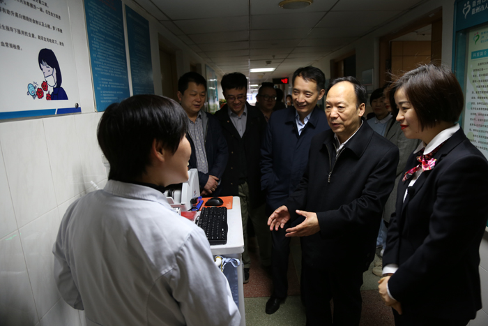 徐卸古一行先后參觀了醫(yī)院門診綜合服務(wù)中心、入院準(zhǔn)備中心及病房,觀摩體驗(yàn)了自助掛號(hào)、預(yù)約檢查、病區(qū)結(jié)算等流程。
