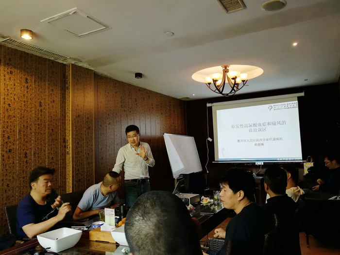 義診過后,在我院內(nèi)分泌科主任胡朝暉的提議下,組織了10余名痛風(fēng)患者參加“痛風(fēng)家族分享會(huì)”。會(huì)上胡朝暉作了《原發(fā)性高尿酸血癥和痛風(fēng)的診治誤區(qū)》的專題講座,通過通俗易懂的語(yǔ)言和幽默風(fēng)趣的講課方式,使得在場(chǎng)的痛風(fēng)患友受益匪淺。