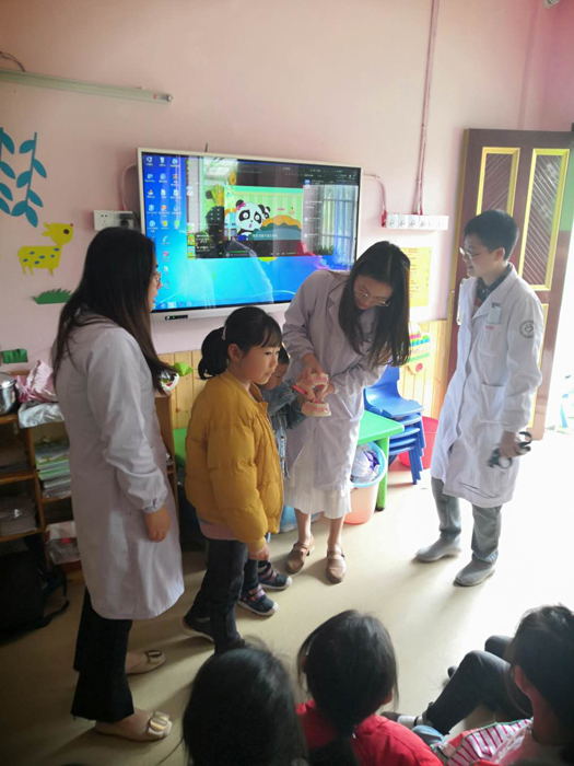 醫(yī)護(hù)人員現(xiàn)場用蛋殼與食醋發(fā)生反應(yīng)的實(shí)驗(yàn)生動形象地告訴小朋友們不良飲食習(xí)慣給牙齒帶來的危害,并教會小朋友正確的刷牙方法。