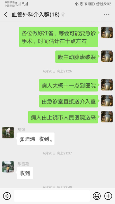 搶救經(jīng)驗豐富的血管外科值班醫(yī)師程國兵也馬上通知醫(yī)院急診科、麻醉科、手術(shù)室做好搶救準備。