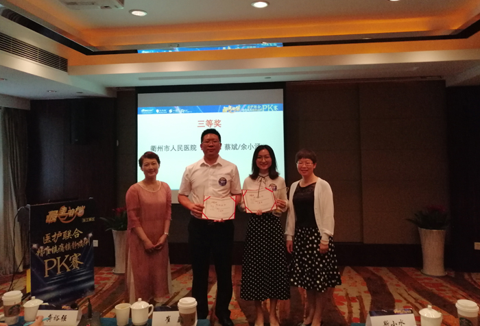 6月22日,“最佳拍檔”醫(yī)護(hù)聯(lián)合精準(zhǔn)鎮(zhèn)痛鎮(zhèn)靜病例PK賽在杭州舉行。來(lái)自全省各縣市區(qū)的九支隊(duì)伍參加了本次比賽,我院重癥醫(yī)學(xué)科蔡斌醫(yī)生和余小涵護(hù)士通過(guò)默契的配合以及精彩的演講,最終脫穎而出,取得了第三名的好成績(jī)!