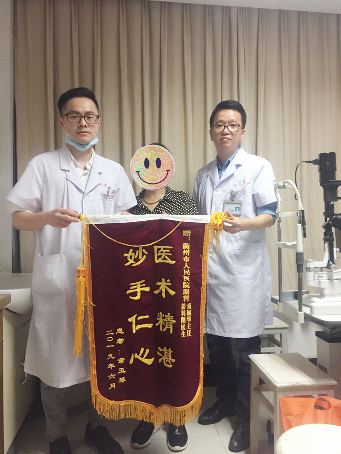 6月19日上午,市民章阿姨來到市人民醫(yī)院眼科門診,將一面印有“ 醫(yī)術(shù)精湛 妙手仁心”的錦旗送到童毓華主任醫(yī)師和他的學(xué)生姜利剛醫(yī)生的手里,并感激地說:“真的特別感謝你們,多虧了你們的幫助,才讓我及時地來院治療,并順利地用上了藥!”