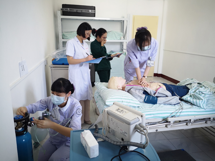 競賽分個人單項賽和團隊配合賽,單項賽項目選取了霧化吸入、女病人導尿、口鼻吸痰,每名選手需完成隨機抽取的兩個單項。單項賽項目,設置過期物品、病人信息錯誤等環(huán)節(jié),以此來考查參賽選手的臨床思維能力、知識應用能力、分析問題和解決問題的能力等臨床綜合能力。團隊賽每組參賽選手3人,個人賽后以小組形式參加綜合案例急救項目。為貼近臨床,競賽現(xiàn)場模擬真實場景,配備氧氣鋼瓶、搶救車、監(jiān)護儀、除顫儀等醫(yī)療設備。
