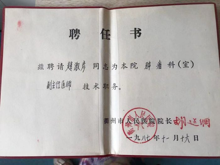 1958年,從浙江醫(yī)科大學畢業(yè)后,趙淑彥就在我院外科工作,擔任過大外科主任,直到1986年離休。1961年浙江省腫瘤醫(yī)院進修回來后,他就組建了腫瘤科,擔任科主任一職。我院腫瘤科的建立、發(fā)展、壯大,無不傾注著趙淑彥的心血。