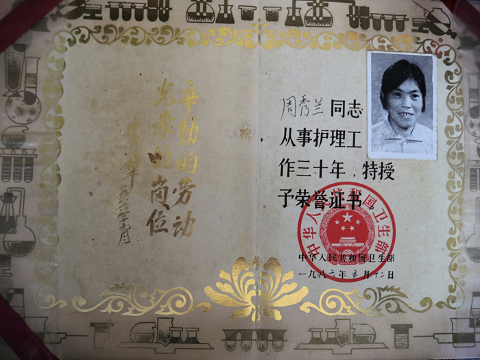 周秀蘭,女,1932年7月出生,18歲時從事護理工作,1970年,調(diào)入我院,榮獲年度先進工作者,國家衛(wèi)生部、省衛(wèi)生廳頒發(fā)的護理工作三十年等榮譽,1989年2月退休,整整四十余年,她把人生中最美好的青春年華奉獻給了護理事業(yè),無怨無悔。