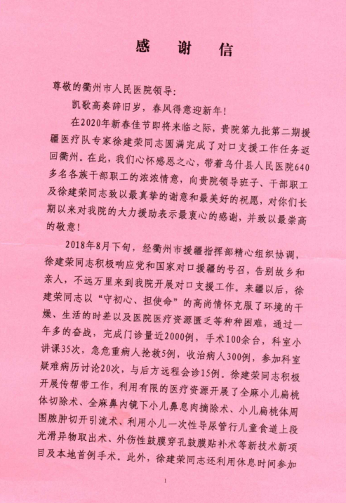 這封感謝信來自千里之外的新疆烏什縣人民醫(yī)院,醫(yī)院640名各族干部職工帶著濃濃的情意,感謝我院多年來給予的關(guān)心支持和無私幫助,感謝醫(yī)療隊專家徐建榮對烏什縣人民醫(yī)院給予的醫(yī)療幫扶。