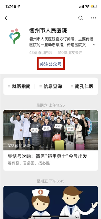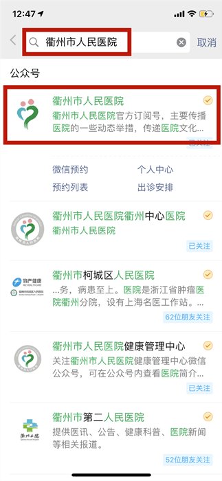 一、關(guān)注“衢州市人民醫(yī)院”微信公眾號(hào)
