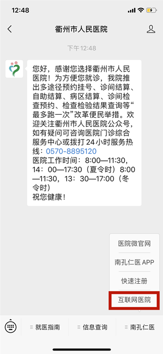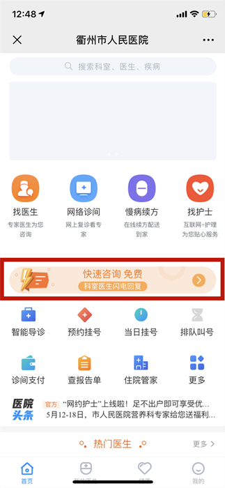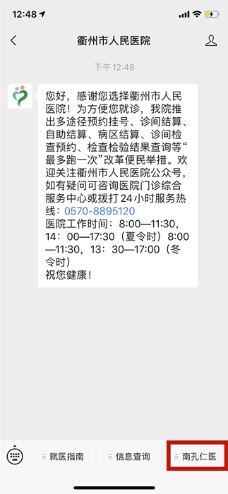 2、關(guān)注“衢州市人民醫(yī)院衢州中心醫(yī)院”微信服務(wù)號(hào),或下載“南孔仁醫(yī)”APP,均可線上咨詢,操作流程同上。