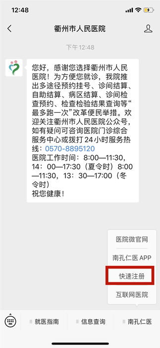 二、快速注冊(cè)。點(diǎn)擊公眾號(hào)下方的“南孔仁醫(yī)”、“快速注冊(cè)”,然后輸入手機(jī)號(hào)注冊(cè)即可。