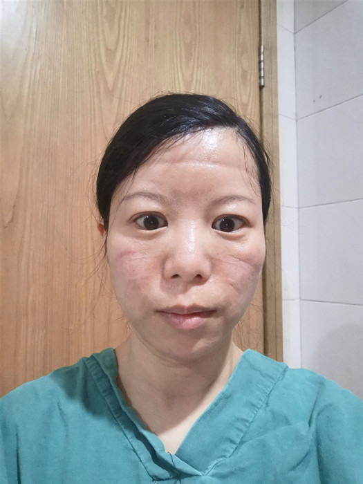 因?yàn)殚L期佩戴防護(hù)面罩,楊慶的整張臉已經(jīng)浮腫。當(dāng)朋友看到,不禁感慨:“這還是那個愛美的楊慶嗎?“樂觀開朗的她卻說:“沒關(guān)系,我很好,謝謝同事好友的關(guān)心,等出關(guān)后再慢慢修復(fù)?!?span>