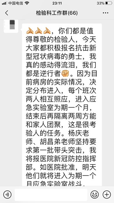 楊慶、胡昌弟、白永鳳、鄭美霞4人就是我院成立應(yīng)急實(shí)驗(yàn)室以來,第一批進(jìn)入應(yīng)急實(shí)驗(yàn)室的醫(yī)護(hù)人員,直面看不見的防“疫”戰(zhàn)場。