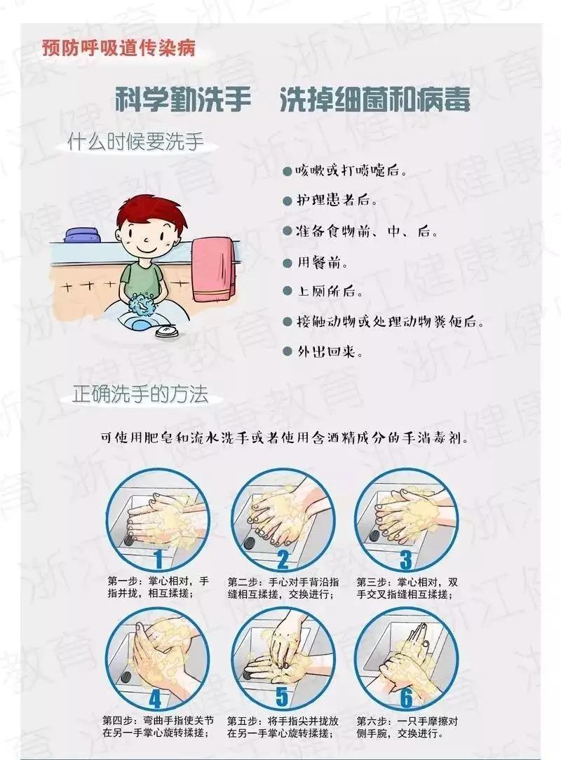 餐前便后、外出回家、接觸垃圾、撫摸動物后,要記得洗手。洗手時,要注意用流動的水和使用肥皂(洗手液)洗手,揉搓的時間不少于15秒。
