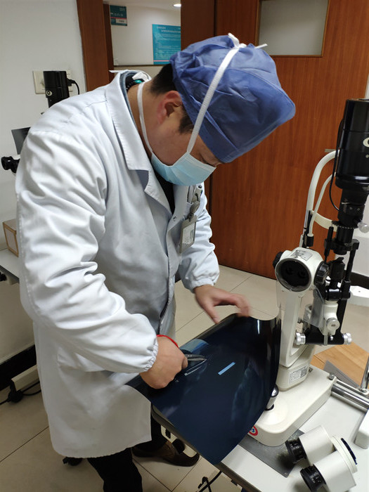 為迎接節(jié)后患者就診高峰期,眼科主任姜方正帶領(lǐng)眼科醫(yī)生開展“生產(chǎn)自救”。他們利用CT、磁共振等廢膠片,自制簡易防護屏,給檢查用的裂隙燈顯微鏡裝上一道防護。