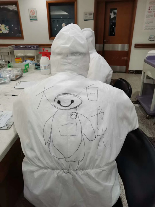2月21日,結束了一天的護理工作后,她又在防護服背后畫畫報平安,“我愛星爸爸”“晚安,祝你好夢”“大白書光”……一句句詼諧的話語看似調侃實則溫情滿滿,你能猜出哪一個才是調皮的她嗎?