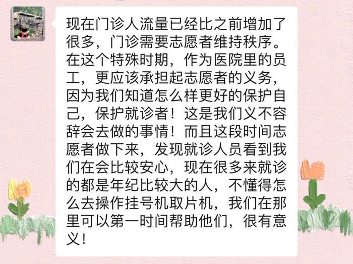“做志愿者的空隙,我還會關注一些其他工作?!彼f,做志愿者不單單是幫助患者就診,在疫情防控期間,志愿服務的同時更要善于發(fā)現(xiàn)就診不流暢的環(huán)節(jié),及時改進,才能保障就診規(guī)范有序。