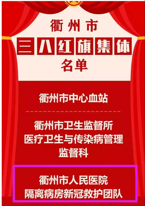 3月7日,市婦聯(lián)公布了2020年度三八紅旗手(集體)、50戶最美家庭等名單。我院隔離病房新冠救護(hù)團(tuán)隊(duì)榮獲三八紅旗集體,鄭慧瑾、趙凱旋、余娜、王莉娟、王鈺、徐慧、彭春仙、鄭彩霞榮獲三八紅旗手。楊慶和方文浩家庭榮獲最美家庭。