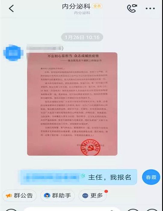 “?!?,隨著一聲清脆的鈴聲,一封《不忘初心顯擔(dān)當(dāng),眾志成城抗疫情》的倡議書出現(xiàn)在我院釘釘群。這是疫情爆發(fā)初期,院黨委致全院黨員干部職工的倡議,內(nèi)分泌代謝病科的一位醫(yī)生隨即發(fā)了一條留言“主任,我報(bào)名!”
