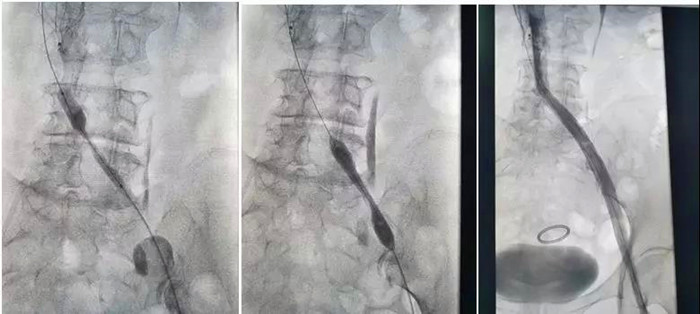 明確血栓部位后,從腫脹的患肢進(jìn)入AngioJet機(jī)械血栓清除裝置,通過(guò)AngioJet吸栓導(dǎo)管?chē)娚淙芩ㄋ幬锖髮?duì)血栓進(jìn)行抽吸。血栓被一點(diǎn)一點(diǎn)抽吸干凈后,再次造影,發(fā)現(xiàn)樊奶奶果然伴有嚴(yán)重的“髂靜脈壓迫綜合征”,如果不進(jìn)行處理,血栓很容易再次復(fù)發(fā)。陸煒帶領(lǐng)血管外科手術(shù)團(tuán)隊(duì)熟練地進(jìn)行了“髂靜脈球囊擴(kuò)張和支架植入”。