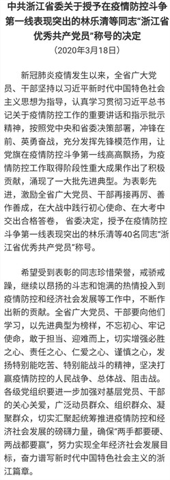 近日,中共浙江省委授予在疫情防控斗爭第一線表現(xiàn)突出的40名同志“浙江省優(yōu)秀共產(chǎn)黨員”稱號。衢州市人民醫(yī)院的田明慶被授予“浙江省優(yōu)秀共產(chǎn)黨員”稱號。