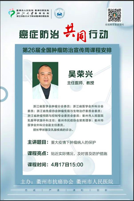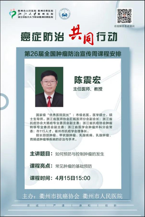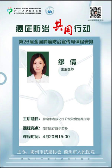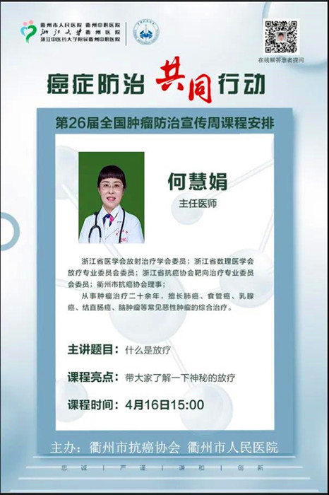 2020年4月15-21日是第26個全國腫瘤防治宣傳周,主題是“癌癥防治共同行動”。我院推出“腫瘤防治科普云課堂”, 4月15日開始,每日下午3:00,衢醫(yī)云課堂準(zhǔn)時上線,還有腫瘤防治在線答疑,足不出戶也能漲知識,最重要的是免費!免費!免費!重要的事情說三遍,快把好消息轉(zhuǎn)出去!