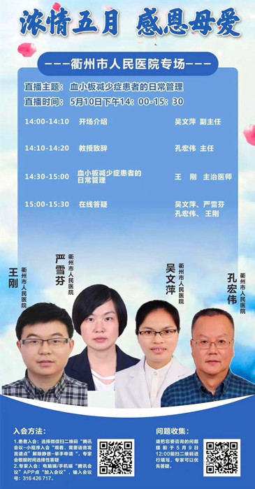 隔離病,不隔離愛!5月10日母親節(jié)即將來臨之際,浙江省醫(yī)師協(xié)會血液科醫(yī)師分會ITP學組牽頭舉辦第五屆中國血小板日系列公益活動“2020感恩母親節(jié)---浙江省十七家醫(yī)院血小板日大型公益直播”,2020年5月10日下午14點至15點30分,我院血液科推出云上公益直播專場。屆時將會對ITP的病因,發(fā)病機制,臨床表現(xiàn),診斷,治療以及患者日常的自我管理,包括出血評估,飲食,用藥,情緒等等的管理進行全方位指導。足不出戶在線答疑,歡迎廣大病友積極參加。