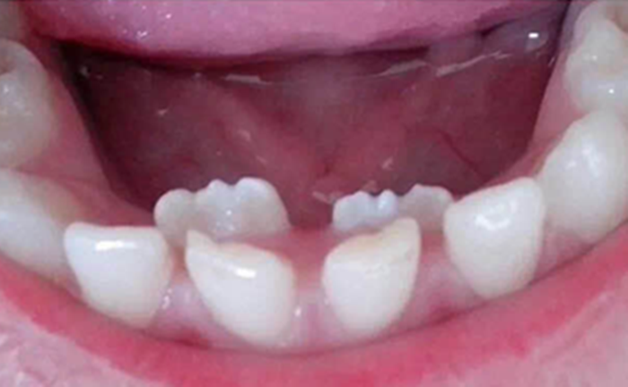 現(xiàn)代飲食過于松軟、精細,家長照顧萌娃時過于精致,將食物切細,乳牙牙根沒有得到充分的刺激和鍛煉,和牙槽骨緊密相連,不易脫落,“雙排牙”就出現(xiàn)了。如果乳牙病變,發(fā)生齲壞、根尖炎癥等情況,則會造成乳牙根吸收障礙,這也是造成“雙排牙”的常見原因。