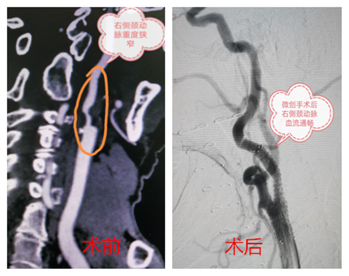 血管外科接診醫(yī)生程國(guó)兵仔細(xì)問(wèn)詢并完善相關(guān)檢查,經(jīng)頸動(dòng)脈CT血管成像提示:右頸內(nèi)動(dòng)脈起始段少量混合斑,管腔中重度狹窄。頭顱磁共振提示:右側(cè)急性腦梗。