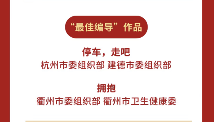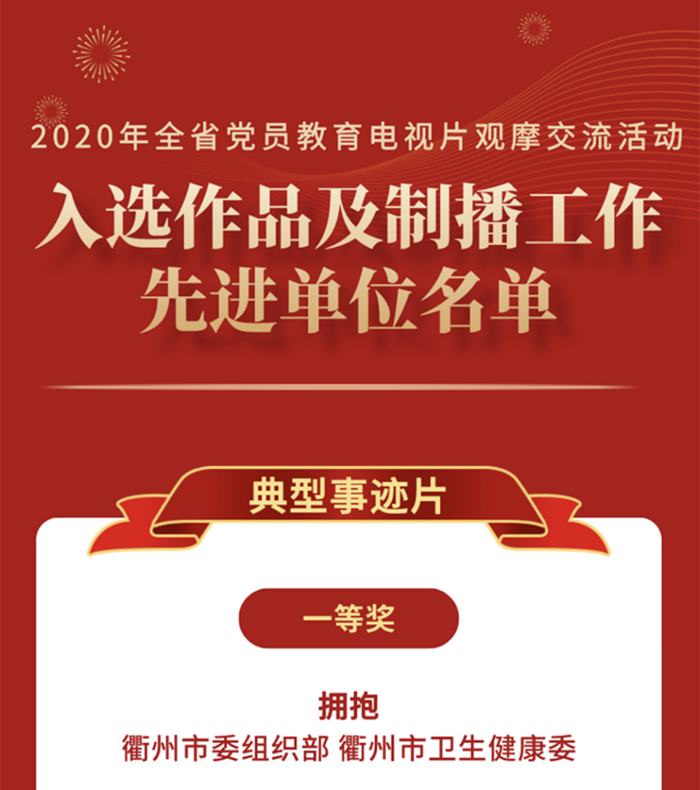 12月29日,省委組織部開展了全省黨員教育電視片觀摩交流活動(dòng),衢州市委組織部選送的8部作品榮獲10個(gè)獎(jiǎng)項(xiàng),其中一等獎(jiǎng)1個(gè)、二等獎(jiǎng)2個(gè)、三等獎(jiǎng)3個(gè)、優(yōu)秀獎(jiǎng)2個(gè)、最佳編導(dǎo)獎(jiǎng)1個(gè)、最佳攝像獎(jiǎng)1個(gè),獲獎(jiǎng)總數(shù)居全省前列。其中由衢州市人民醫(yī)院牽頭制作的黨員教育電視片《擁抱》榮獲典型事跡片一等獎(jiǎng)和“最佳編導(dǎo)”作品。