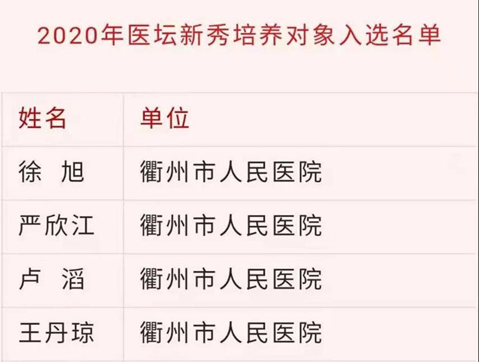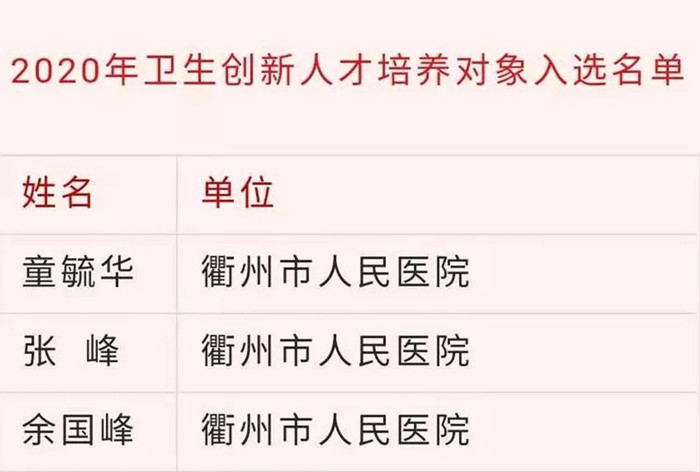 根據(jù)《浙江省新一輪衛(wèi)生高層次人才培養(yǎng)工程實(shí)施辦法》(浙衛(wèi)發(fā)〔2019〕58號(hào))要求,經(jīng)個(gè)人申報(bào)、單位審核公示、主管部門推薦、專家評(píng)審、浙江省衛(wèi)生健康委黨委會(huì)審議等程序,遴選產(chǎn)生了2020年度衛(wèi)生創(chuàng)新人才和醫(yī)壇新秀培養(yǎng)對(duì)象。衢州市共11名對(duì)象成功入選,其中衛(wèi)生創(chuàng)新人才培養(yǎng)對(duì)象4名,衢州市人民醫(yī)院占3名,該成績實(shí)現(xiàn)醫(yī)院零突破;醫(yī)壇新秀培養(yǎng)對(duì)象7名,衢州市人民醫(yī)院占4名,在衢州醫(yī)療系統(tǒng)中遙遙領(lǐng)先。