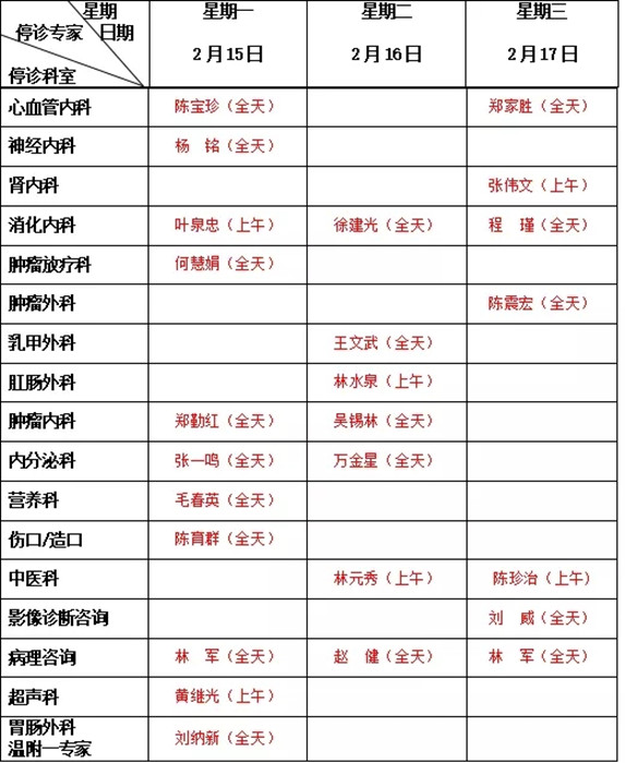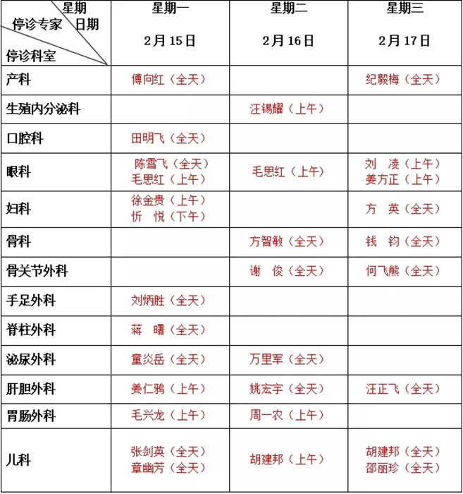 2.2月16日停診科室:眼視光夜門診、產(chǎn)科高危門診、房顫門診、心血管內(nèi)科普通門診、 神經(jīng)內(nèi)科普通門診、手與顯微外科??崎T診。