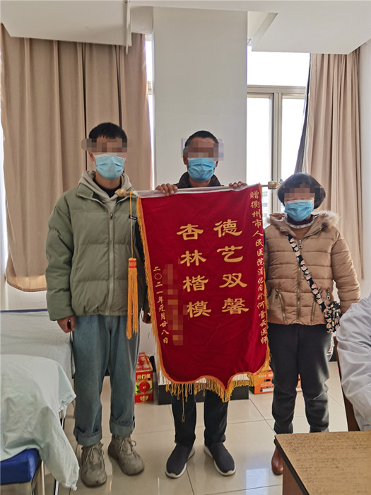 近日,安先生攜家人一起來到我院消化內(nèi)科門診,將一面寫有“德藝雙馨、杏林楷?!钡腻\旗交到消化內(nèi)科主任醫(yī)師何雪云手中,連聲稱贊何雪云醫(yī)德高尚。