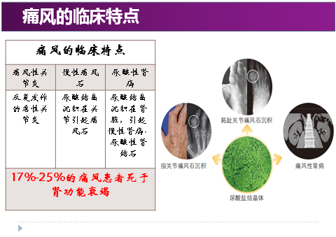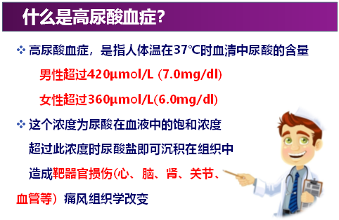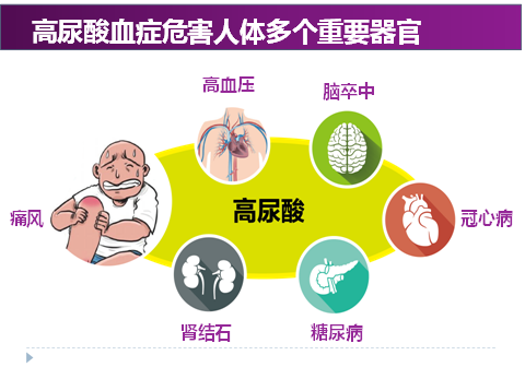 高尿酸血癥發(fā)病率逐年上升,目前已經(jīng)成為繼高血壓、高血糖、高血脂后的第四高。大量研究表明,高尿酸血癥是糖尿病、高血壓、慢性腎病、冠心病、腦卒中等疾病的危險(xiǎn)因素。而痛風(fēng)只是冰山一角,痛風(fēng)以外的無癥狀高尿酸血癥危害是潛在的、持續(xù)性,長(zhǎng)期危害性更大,須引起人們的足夠重視。鑒于高尿酸血癥的嚴(yán)重危,害性,國(guó)內(nèi)外共識(shí)和指南建議血尿酸>420umol/L起始藥物干預(yù)治療使血尿酸長(zhǎng)期控制在360umol/L以下,減少高尿酸血癥帶來的嚴(yán)重并發(fā)癥。