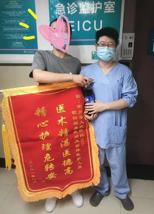 至今,“可樂”男孩已經(jīng)出院半個月了,在醫(yī)師節(jié)這個特殊的日子里,他給這個曾經(jīng)幫助過他的醫(yī)護送來了節(jié)日禮物——錦旗。EICU可愛的醫(yī)護也回贈了這個可愛的大男孩一瓶可樂,兌現(xiàn)了之前許下出院就能喝可樂的承諾,希望他以后的生活“德行可象,聲氣可樂”。