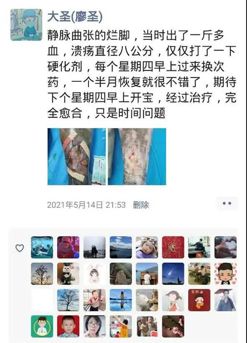 腿癢是陳老先生發(fā)生靜脈曲張的典型癥狀,從剛開始的不以為然到后來的不斷抓撓,結果導致靜脈大出血。慶幸的是,經(jīng)過我院血管外科廖圣醫(yī)師的幫助下,陳老先生大如碗口的潰爛面(入院時直徑超過八公分)漸漸愈合,陳老先生康復出院。