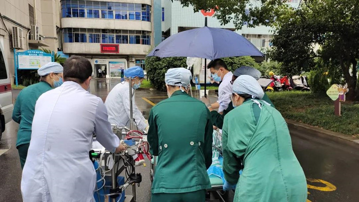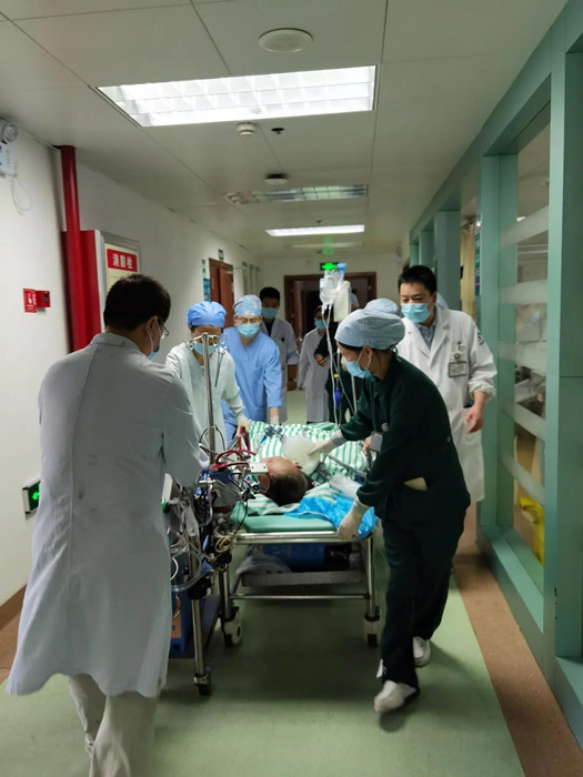 時間一點(diǎn)一點(diǎn)在流逝,朱先生的生命也在流逝。醫(yī)院急救快速反應(yīng)體系急速啟動,急診科主任吳德軍、醫(yī)務(wù)處處長柴東劍、醫(yī)療副院長何冬娟第一時間趕到現(xiàn)場參與急救,溫州醫(yī)科大學(xué)急診醫(yī)學(xué)專家、醫(yī)院執(zhí)行院長李章平教授隨后趕到現(xiàn)場指揮,院內(nèi)多學(xué)科急救團(tuán)隊成立,在持續(xù)心肺復(fù)蘇的同時,即時超聲精準(zhǔn)評估心臟和容量狀態(tài),體外膜肺氧合(ECMO)團(tuán)隊快速行動,僅用13分鐘便成功在急診搶救室就地上機(jī)。在ECMO支持下,朱先生自主呼吸恢復(fù),血壓回升到80/60mmHg后被成功轉(zhuǎn)往重癥醫(yī)學(xué)科作后續(xù)治療。