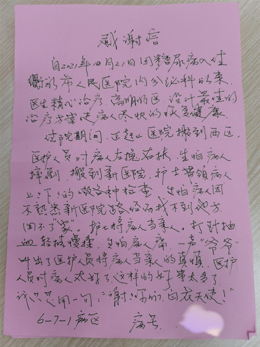 他在信中寫到:“住院期間正趕上醫(yī)院搬到西區(qū),醫(yī)護(hù)人員對(duì)病人左攙右扶,生怕病人摔倒;搬到新醫(yī)院,護(hù)士帶病人上上下下做各種檢查,生怕病人因不熟悉新醫(yī)院路線而找不到地方,回不了‘家’?!?
