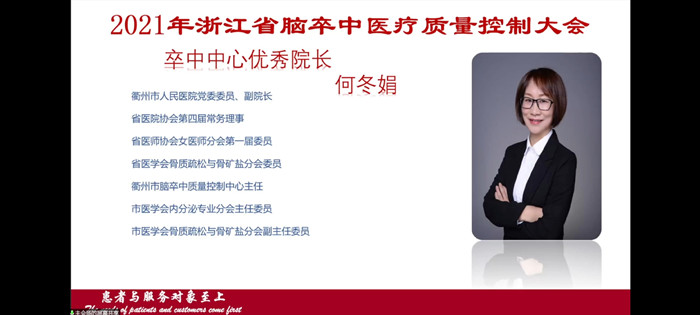 11月27日,從浙江省腦卒中醫(yī)療質(zhì)量控制大會傳來好消息,通過大會的前期選舉和推薦,我院副院長何冬娟榮獲“卒中中心優(yōu)秀院長”榮譽稱號,全省腦卒中質(zhì)控中心僅產(chǎn)生2位優(yōu)秀院長,該榮譽的獲得代表衢州地區(qū)卒中中心建設工作取得新突破。