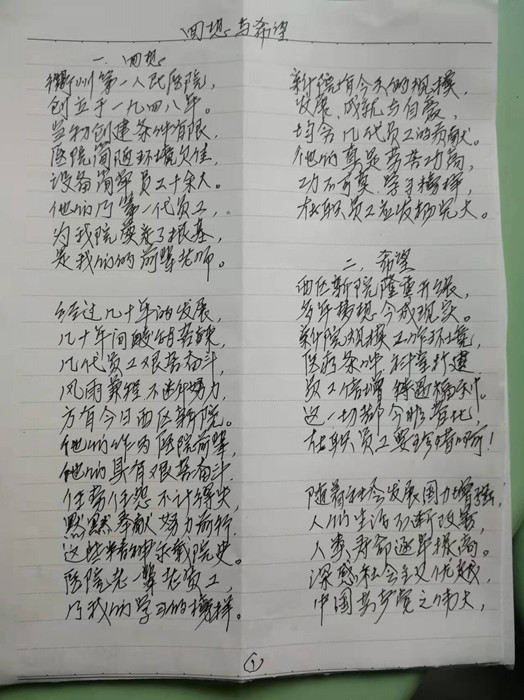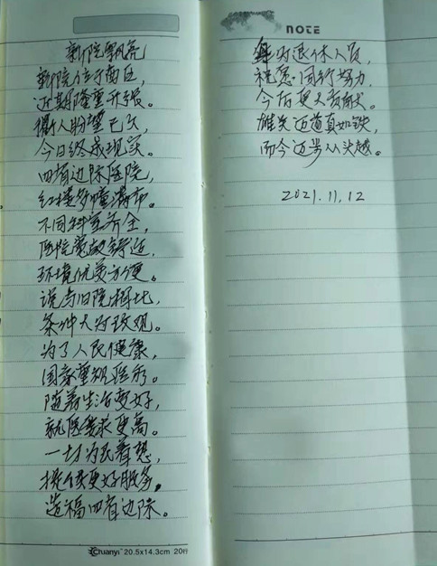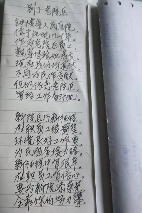 陳土根,72歲,中共黨員,骨科退休醫(yī)生,1968年10月參加工作,至今已退休12年,在醫(yī)院整體搬遷期間,他手書詩(shī)詞,些許顫巍的筆跡記載了對(duì)醫(yī)院的美好祝福。