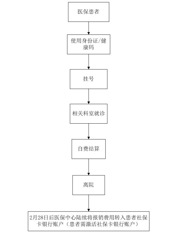 (二)門診醫(yī)保報銷。在本院發(fā)生的門診費用由患者先行墊付(自費結(jié)算),2022年2月28日起,各級醫(yī)保中心將主動發(fā)起報銷支付業(yè)務(wù),將患者停機期間實際報銷費用直接支付至患者社保卡銀行賬戶,患者無需再到窗口辦理人工報銷。