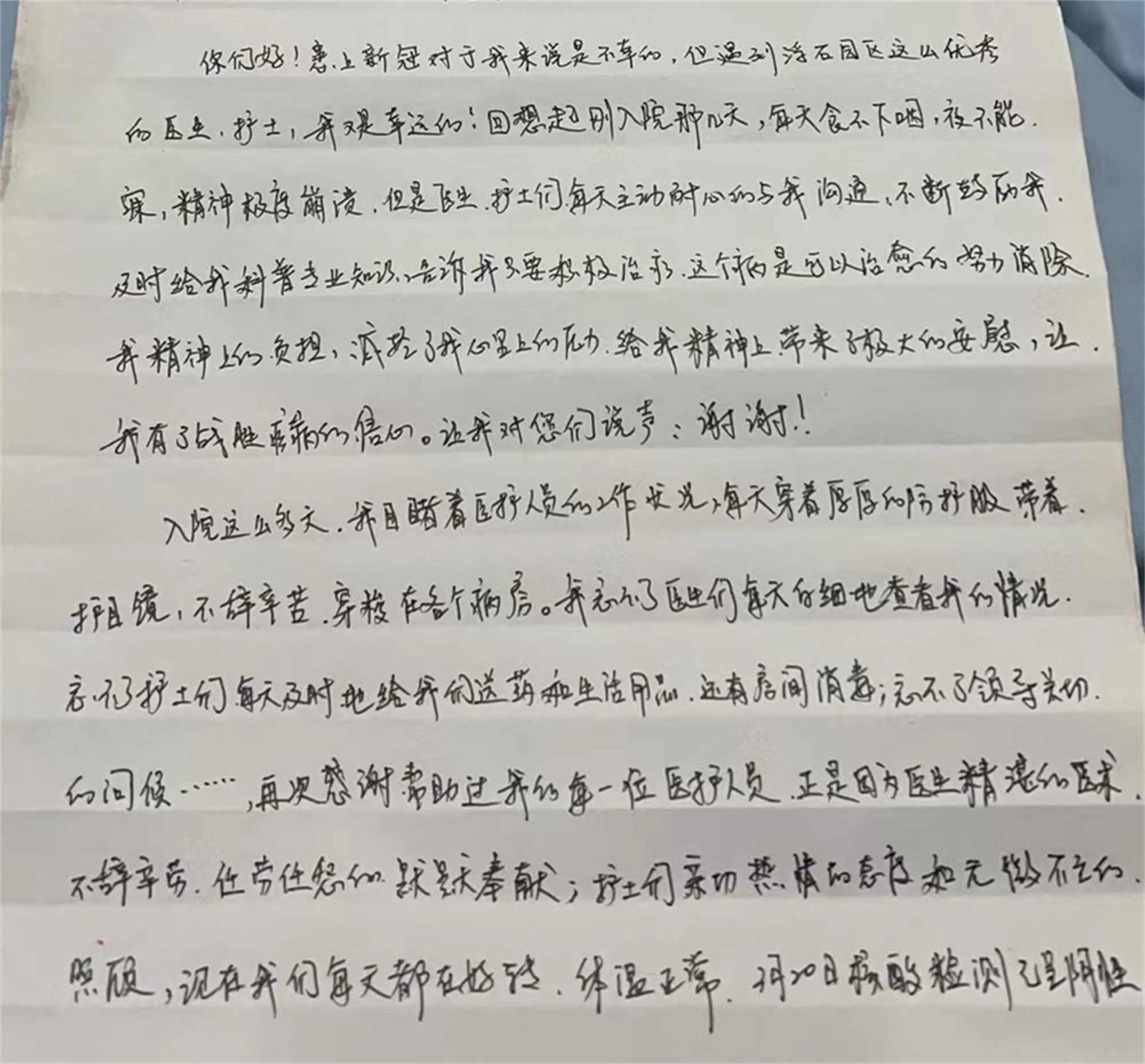 “確診新冠后,精神是極度崩潰的,感覺到無助,寢食難安,但是到了病區(qū),醫(yī)生、護(hù)士主動(dòng)耐心與我溝通,不斷鼓勵(lì)我,告訴我這個(gè)病是能治好的。現(xiàn)在我出院了,我真的很感謝隔離病區(qū)醫(yī)護(hù)人員照顧與治療。”患者程女士激動(dòng)地說。