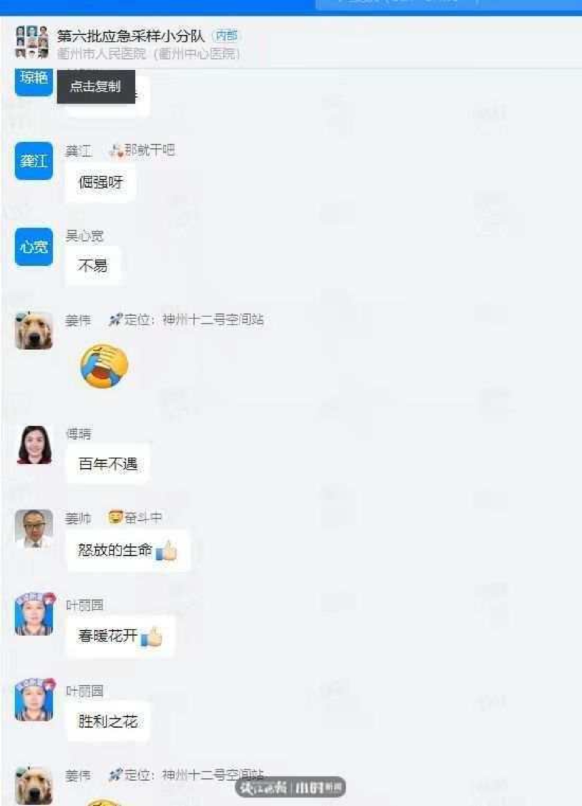 當姜偉把這張自嘲的照片發(fā)到“衢州市人民醫(yī)院第六核酸采樣隊群”時,群里的小伙伴炸開了鍋,一句句神點評撲面而來。