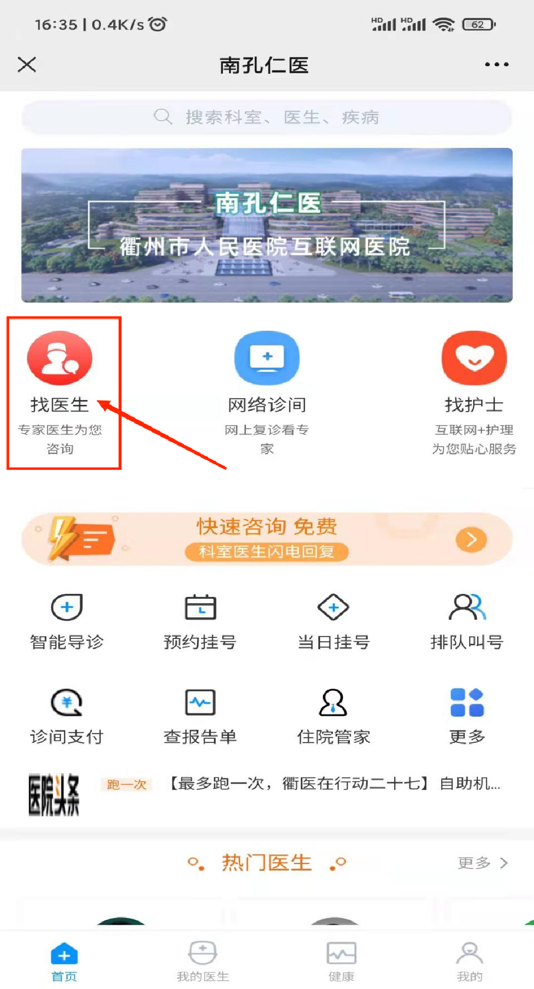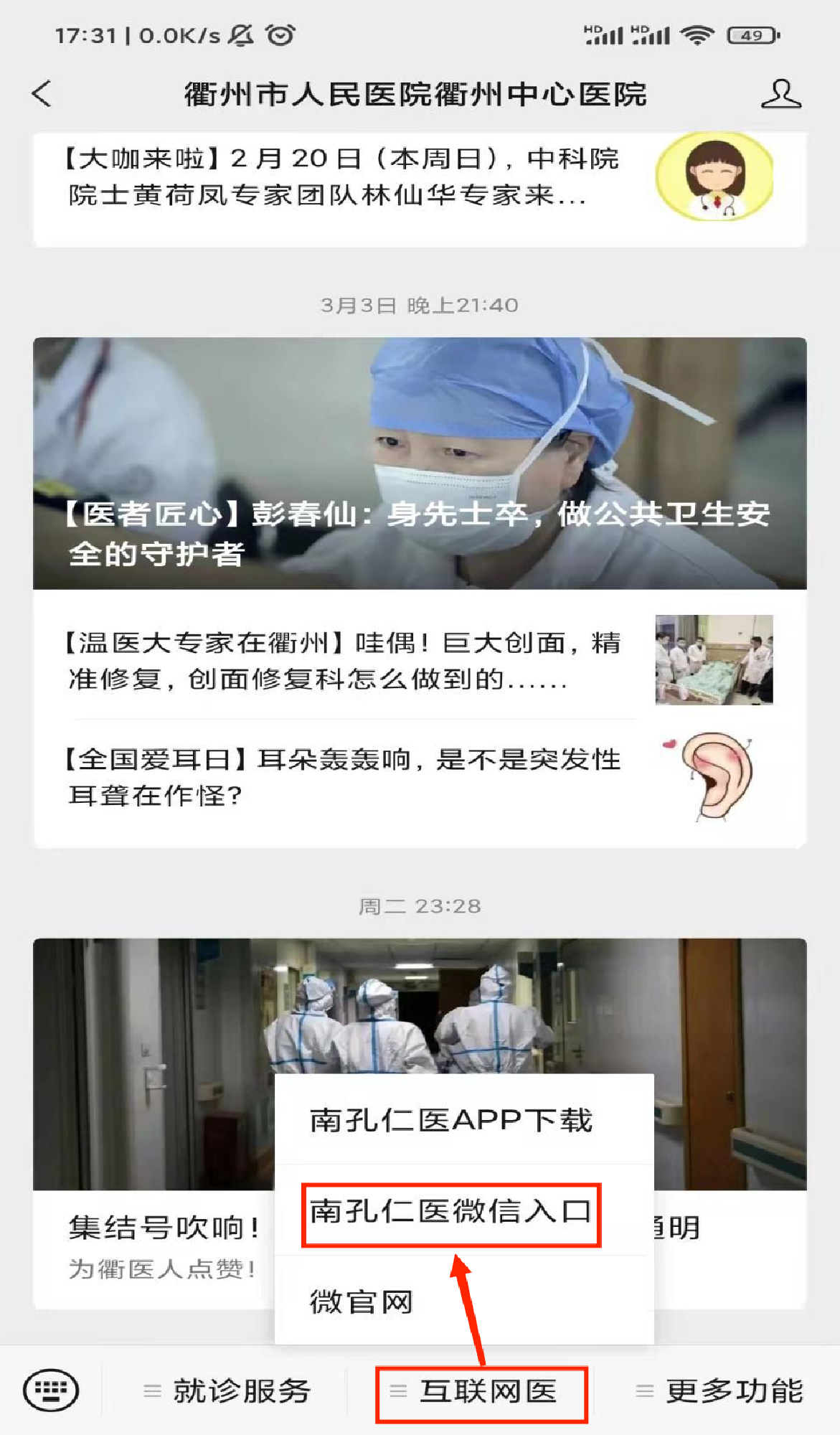 關(guān)注【衢州市人民醫(yī)院衢州中心醫(yī)院】微信公眾號(hào),依次選擇【互聯(lián)網(wǎng)醫(yī)院】、【南孔仁醫(yī)微信入口】