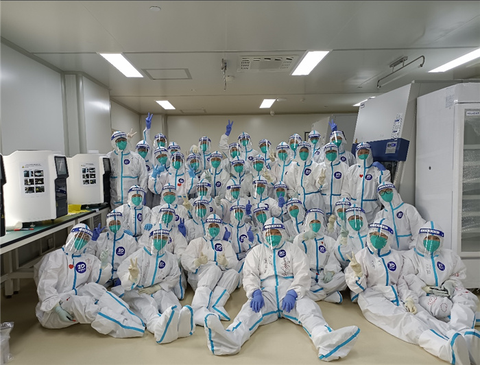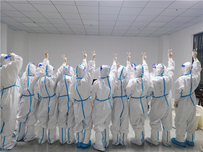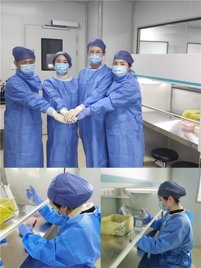 傅向紅主任迅速做了統(tǒng)籌安排,她帶領(lǐng)科室毛蘇清醫(yī)師、吳敏云醫(yī)師、曹穎醫(yī)師、鄭利花護士第一時間奔赴一線。生殖實驗室技師王小紅、王毓因為有PCR上崗證,主動請纓來到核酸檢測基地,加入了不分晝夜的核酸檢測組。