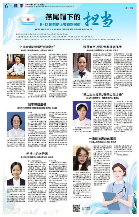 今年5月12日是第111個(gè)國際護(hù)士節(jié)。今天,衢州市衛(wèi)生健康委員會(huì)聯(lián)合衢報(bào)傳媒集團(tuán)推出“燕尾帽下的擔(dān)當(dāng)”——5·12國際護(hù)士節(jié)特別報(bào)道,盡顯燕尾帽下的風(fēng)采。